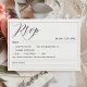 Modern Chic and elegant script black and white script wedding rsvp with food choices, allergies, dietary requirements and song choice.
