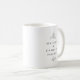 Elegant black and white wedding coffee mug design features the names of the couple and the event date in a beautiful classic serif font in sophisticated black on a crisp white background. Fresh traditional composition is embellished with decorative botanical leaves. Design repeats so that it is visible when held in either hand. All colors in this design may be customized. E-mail invitationsuites@gmail.com with questions or custom color requests.