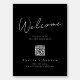 This modern, minimalistic wedding welcome sign features an elegant script front. The sign includes a digital seating chart with a QR code. The design plays with the simplicity of a black and white typography design. It's the perfect choice for couples who appreciate clean and modern elegance.