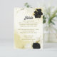 Beautiful wedding details enclosure card featuring black and white flowers and gold leaves .