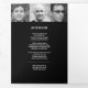 Simple modern graphic funeral program in black and white. Replace the sample text and twelve placeholder photos with your own special photos and memorial order of service, obituary, reading or poem, and acknowledgments, and personal information details. Other matching funeral keepsake remembrance items are available. Design by www.mylittleeden.com