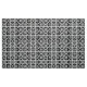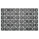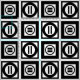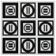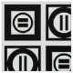 Stylish fabric features a bold geometric pattern of repeating black squares with space between them. The diagonally opposed thick squares each contain a thin black circle with a thick equal sign inside. In contrast, the thin squares each contain a thick black circle that touches the square’s edges with a thin vertical equal sign inside. Great for home decor.