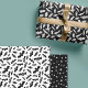 A set of wrapping paper sheets for Halloween featuring three black and white patterns: ghosts; bats; and stars.