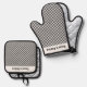 Black White Gingham Checks Design Oven Mitt and Pot Holder Set with customizable text.