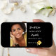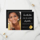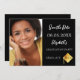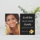 On front: Add your own vertical size photo of the graduate. A chic black background, white text. Templates for a name and date. The name and the text: Save the Date are written with a modern hand lettered style script. With a modern abstract faux gold cap, tassel topper.