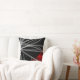 This modern throw pillow features a stylish organic abstract design of white and gray ribbons with red accents on a black background.
