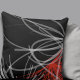 This modern throw pillow features a stylish organic abstract design of white and gray ribbons with red accents on a black background.