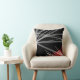 This modern throw pillow features a stylish organic abstract design of white and gray ribbons with red accents on a black background.