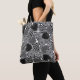 A black and white decorative hearts pattern tote bag.