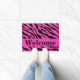 Welcome visitors to your home with this wild splash of color of bright hot pink fushia and black zebra skin pattern door mat. This door mat is customized with the word Welcome that you can change to another word or name. A bright or hot pink fuchsia strip gives an area for personalization. Enjoy this popular and contemporary design that will add a trendy and colorful home decorative accent. This design is available in several color combinations in this store.