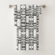 These striking bath towels present a contemporary geometric abstract pattern of rectangles and squares which resembles an interlocking maze