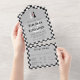 Gay all in one wedding invitation with a chess theme, with two king pieces at the top of the invitation, one white and one black. Add your initials between the chess pieces with a red heart. Your names in a large bold elegant font with a beautiful ampersand beneath in pale gray against a black background. A checkered background.