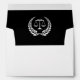 Black and white laurel leaf with scales of justice in a silhouette. Black background. Personalize this graduation item with law school, legal profession such as attorney, lawyer, paralegal, college or university and your name and title along with graduation ceremony or open house party information.