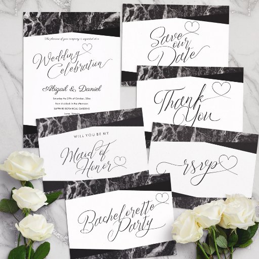 Congratulations on your engagement! Now it's time to share your fantastic news with your nearest and dearest with this black and white marble custom bachelorette invitation! Customise with your details and you're good to go! This card is part of a curated and coordinated wedding collection called "Black Marble Script Wedding" in the Celebrations Studio store where there is a range of matching wedding stationery, decor and mailing products.