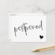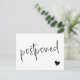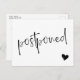Tell your guests the wedding has been postponed and give them a new date or the link to your website for more information with this black and white postcard featuring a minimalist typography design where postponed is written across the change the date postcard in a charming hand-writing script along with a black heart. On the other side you can write the new information and, beneath a small heart, your names in a clean modern font.