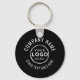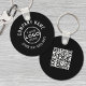 Black Modern Round Business Keychain with QR Code. This sleek and minimal round keychain is perfect for professionals, entrepreneurs, and small business owners who want to share their business info on the go. The front features an all-black background with your company logo in the center for a bold, modern look. Around the top edge, there's space for your company name or custom text, and around the bottom edge, you can add a second line like your website, tagline, or location.