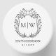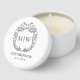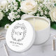 This mini candle features a sticker on the lid with a clean, modern design. The background is white with elegant black artwork and text for a crisp, timeless look. At the top of the sticker sits a simple hand-drawn crest made of delicate floral leaves, with the bride and groom’s first initials displayed inside the crest.
