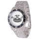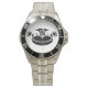 Has heft and feel of expensive stainless steel quartz watches. Good band with safety catch. I removed links, which is easy because engraved arrows show direction to push the linking pins. As always by this seller, the image (a railroad logo) is a perfect reproduction of my emailed image, and is precisely spaced and aligned.
