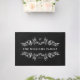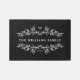 Black rug with your name framed by mirrored half-wreaths of leaves and berries. Add your initial and the year your family was established in an elegant white font.
