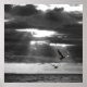 A beautiful black and white poster of a calm ocean with the sun peering through the clouds radiating rays onto the sea and the birds are flying above the sea—ideal for any decor at home or in the office.