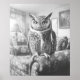 Decorate your home with this unique black and white detailed pencil drawing inspired illustration. A large, serene owl sits on a floral-patterned couch in a cozy living room with framed art and a lamp. The owl’s intense gaze contrasts with the calm setting. Makes your living room or bedroom a special place to relax and unwind.