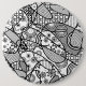 "Patterns Run Amok, 1" is the first in a series of black and white whimsical designs featuring a hand-drawn outline that's then filled in with repeating patterns. Circles, rings, squares, scales, flowers, and more are interspersed over the surface in an unpredictable array.