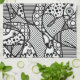 "Patterns Run Amok, 4" is the fourth in a series of black and white whimsical designs featuring a hand-drawn outline that's then filled in with repeating patterns. Circles, rings, squares, bulls-eye, targets, flowers and more are interspersed over the surface in an unpredictable array.