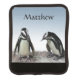 Easily personalize or remove the text on this luggage handle wrap which features adorable African Penguins standing on a rocky ledge against a sky blue background. They are aquatic, flightless birds whose wings have become flippers. Each has a black stripe and black spots on the chest. The pattern of spots is unique for every penguin, just like human fingerprints. Make your luggage stand out, so it is easily identified and not mistakenly taken by someone else.
