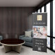 A black background. Personalize and add a photo, your company, business logo, text, room number. QR code to your website, event program etc. White text.