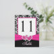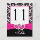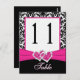This black and white damask table number postcard has a PRINTED hot pink ribbon and a pair of PRINTED faux glitter and jewels joined hearts on it that matches the wedding invitation shown below. **You must change the number 11 to each of the table numbers you need, add it to your cart, and then return and repeat the process until you have all the individually numbered cards that you need in your cart. Stand it on a small easel, or in your centerpieces. If you need assistance, email niteowlstudio@gmail.com.