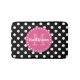 Cute and girly polka dot pattern in black and white with a trendy pink label frame with white dots, custom monogram initial letter and personalized name. An elegant customizable gift for a girl or woman that loves elegant geometric patterns that are personalized.