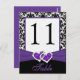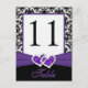 This black and white damask table number postcard has a PRINTED purple ribbon and a pair of PRINTED FAUX glitter and diamond jewels joined hearts on it that matches the wedding invitation shown below. **You must change the number 11 to each of the table numbers you need, add it to your cart, and then return and repeat the process until you have all the individually numbered cards that you need in your cart. Stand it on a small easel, or in your centerpieces. If you need assistance, email niteowlstudio@gmail.com.