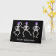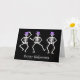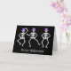 Start dancing with these skeletons with this skeleton happy Halloween greeting card. Three skeletons are dancing a jig on a black background on the front of the card with the words "Happy Halloween". The words on the front and on the inside can be customized to your own words. A single dancing skeleton is inside the card with customizable greeting.. The hand painted original art features dancing skeletons with purple top hat on their skulls and is in the colors black and white with purple. Check for my other products with this art for goulish products for Halloween including invitations, greeting cards, tee shirts, electronic cases and more. Fully customizable for personalization. The original art is from Phyllis Dobbs who wishes you a happy and ghoulish Halloween.