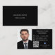 A classic business card on a black background. Personalize and add Your name, text, profile photo, contact info and your own QR code to your website address or social media account. Facebook icon.