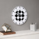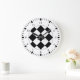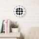 A wall clock with a racing theme of black and white squares on the face, black numbers and the minutes marked in black. Click Customize It to change background colors and more.