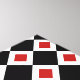 A stylish graphic pattern of interlocking black and white diamond shapes. Each white diamond contains a small red diamond adding depth to the original design.