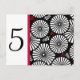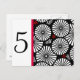 Guide your guests with this bold and stylish number card for your reception tables. The design features a modern black and white sunburst pattern along the side, with the table number clearly visible on the clean white background. A vibrant red stripe and small red leaf accents give a sharp pop of color to the geometric design. This is a unique and modern way to organize your seating.