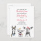 Your little one is turning one! Invite your special guests with this adorable invitation postcard featuring hand drawn farm animals (a horse, a pig, a cow and a chick) in black and white. Baby's name, "first birthday" and the date are in red hand lettered script typography, and personalized in a chic modern black sans serif. Copyright Elegant Invites, all rights reserved.