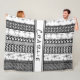Personalize this modern, unique, black-and-white blanket by changing the name over the overlay. /// Often a favorite, black and white is, in this design, covered with retro patterns interspersed with vertical black stripes. Stars, sparkles, flowers, rounded squares with circles inside, other circles... Clean, simple, basic, fun.