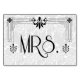 You can personalize all the text on this black and white art deco style roaring 20s (twenties, 1920's) glamorous and ritzy personalized affordable wedding Mrs. card. You are meant to place this on the back of the bride's chair. Usually it is hung with ribbon or fabric. The design features a black art deco frame on white background with a floral damask style pattern overlay in the back. There is a Mr. card to go with it for the groom.