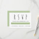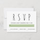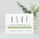 Modern black, white, green typography wedding RSVP response card. It features the word RSVP in black in a modern font and a band in sage green. The back includes a geometric pattern in white on sage green.