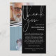 Thank you card for a memorial service featuring two photos of your loved one on the back. On the cover, beneath Thank You written in a hand-writing script, add the thank you wording in white against a black background.