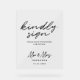 A simple minimalist white background and black script text "kindly sign" wedding table sign to encourage your guest to sign your wedding guest book.