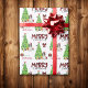 The repeated pattern on this cute Christmas wrapping paper is an image of an adorable black and white parti color Cocker Spaniel wearing a red and white Santa hat. The dog sits among brightly wrapped gift packages beside a decorated Christmas tree. A bullfinch bird is landing on the tree behind it. Stylized red and black buffalo plaid text says MERRY CHRISTMAS", and your own signature is in two fields for you to customize.