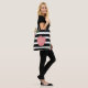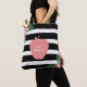 A tote for teachers featuring an illustration of a pink apple over a black and white striped background with floral designs at top left and bottom right. Personalize the name.