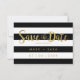 Modern Save the Date wedding invitation cards with black & white striped background with gold foil effect font.