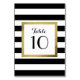 Modern wedding table number cards with black & white stripe background with gold foil effect frame.