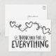 Sending handwritten Thank you notes to friends and family never goes out of style. This fun thank you postcard features a hand drawn string of black hearts highlighting your Thank You for everything greeting printed in a bold black font with a crisp white background.