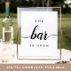 Invite guests to grab a favorite libation from the bar with our charming wedding bar sign. 8x10 poster features "the bar is open" in crisp black calligraphy script and block lettering.