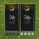 Black White Wedding Cornhole Set with Mr Mrs Text, Yellow String Lights on a Solid Black Background.